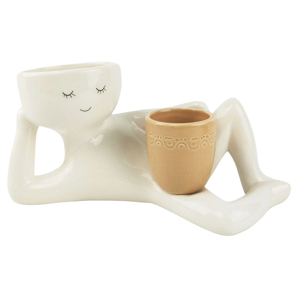 1.Eye-Catching Design: This relaxing person holding pot planter is a conversation starter, featuring a unique and artistic form that adds a touch of whimsical originality to your home decor, complete with two plant spots (plants not included) for displaying small greens.